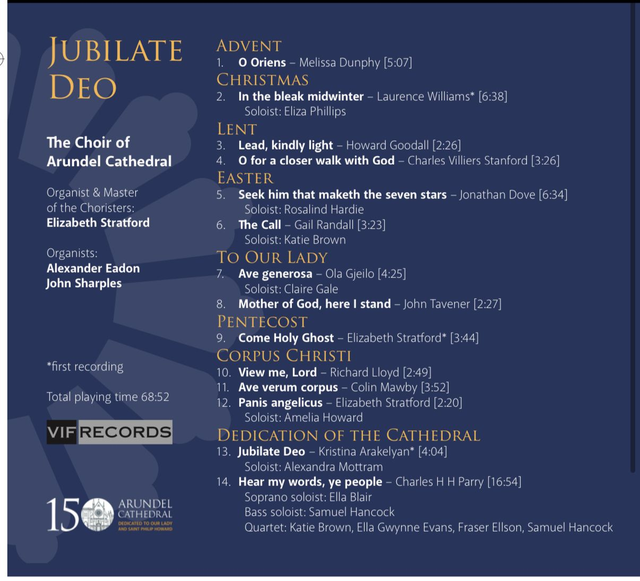 Jubilate Deo, recorded early in 2024, features music used for the 150th anniversary celebrations at Arundel Cathedral. First recordings of pieces by Kristina Arakelyan, Elizabeth Stratford and Laurence Williams are included along with Parry's monumental anthem Hear my words, ye people.